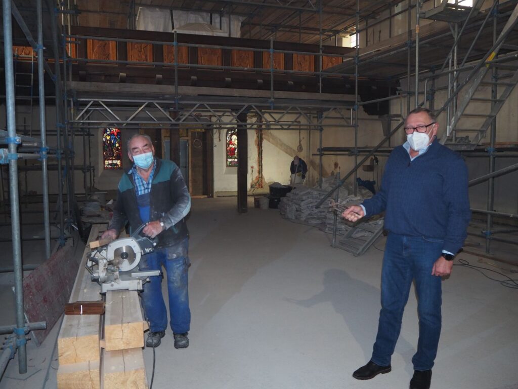 Wer den Blick zur Decke richtet, erblickt hier im Haupthaus eine Kassettendecke. Teile davon sind abgenommen und aufgebessert worden. Nachdem hier auch die Lampen versetzt und teilweise anders platziert werden, mussten Löcher „geflickt“ werden. Auch im Chorboden hat man die Elektrik neu mitverlegt, was vor allem in Eigenleistung geschah. Damit die Holzelemente in neuem Glanz erstrahlen, werden diese noch fachmännisch gereinigt, teilweise abgebeizt und farblich aufeinander angepasst.